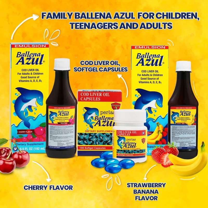 Ballena Azul Emulsion is indicated for children of 2 years and up, contributing to strengthening the immune system, with Omega 3, cod liver oil, fluorine and vitamins A, D, E and B1. Protects the heart, reduces cholesterol and supports the formation of strong bones and teeth.