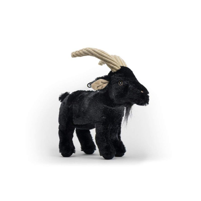 Billy goat premium "Barnyard Baller" dog toy. This adorable and realistic toy is durably made with a soft plush, crinkle-lined backside and embroidered for safety facial features. It has a tennis ball inside and no noisy squeaker... so if a super chewer, your pup has another toy to play with! Measures approximately 9".