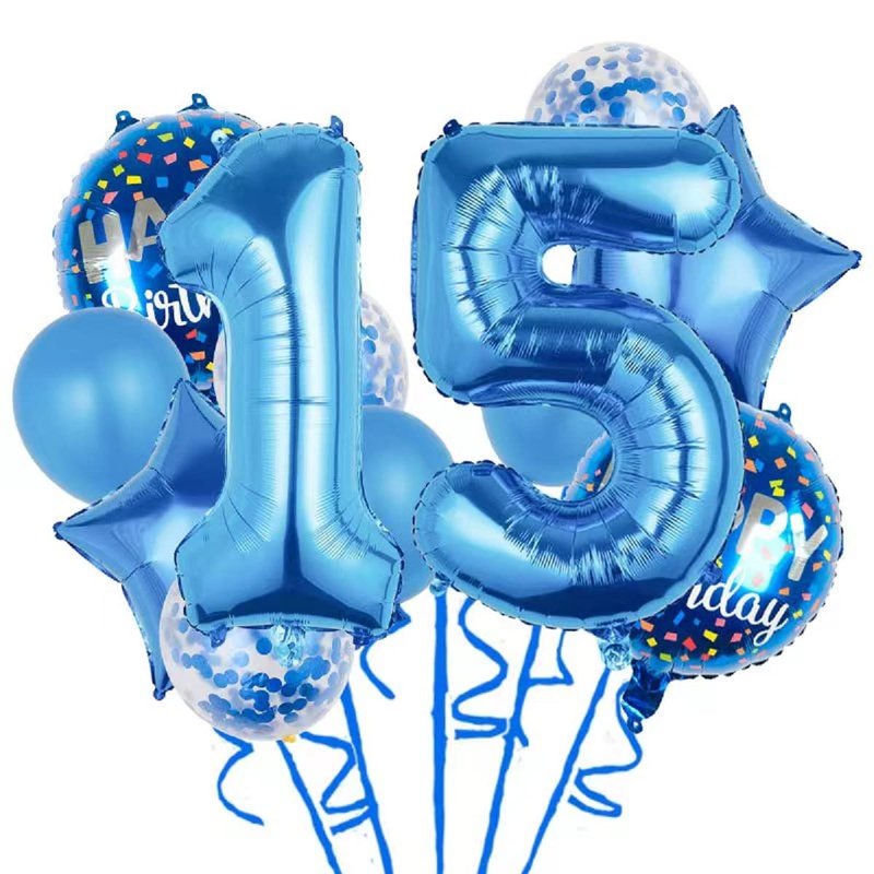 - Package comes with 2pcs 32 inch Number 15 Foil Mylar Balloons, 2 pcs 18 inch Letter Balloon, 3 pcs 12inch blue latex balloon, 3 pcs 12 inch blue confetti balloon, 2 pcs 12inch stars,1 ribbon.