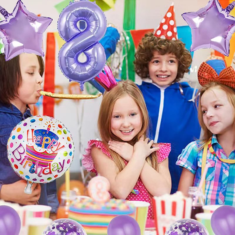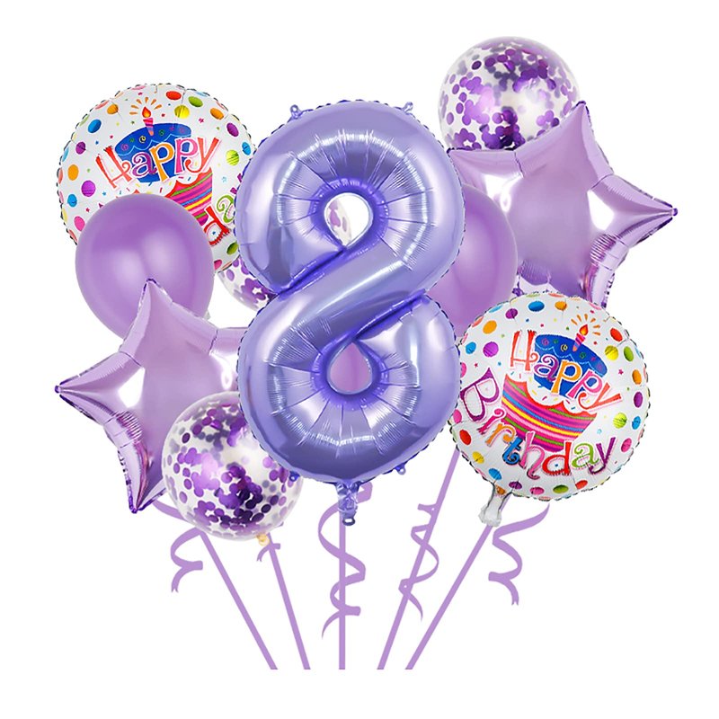- Package comes with 1pcs 32 inch Number 8 Foil Mylar Balloons, 2 pcs 18 inch Letter Balloon, 3 pcs 12inch purple latex balloon, 3 pcs 12 inch purple confetti balloon, 2 pcs 18inch stars,1 ribbon.