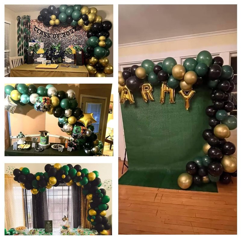 - What's Included: Enhance your party with our Green Black and Gold Balloon Kit! This set features 30 black balloons, 20 green balloons, 20 metallic gold balloons, all sized at 12 inches. Plus, we've included balloon ribbon to perfect your black and gold theme decor.