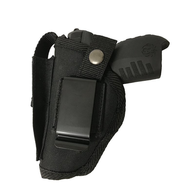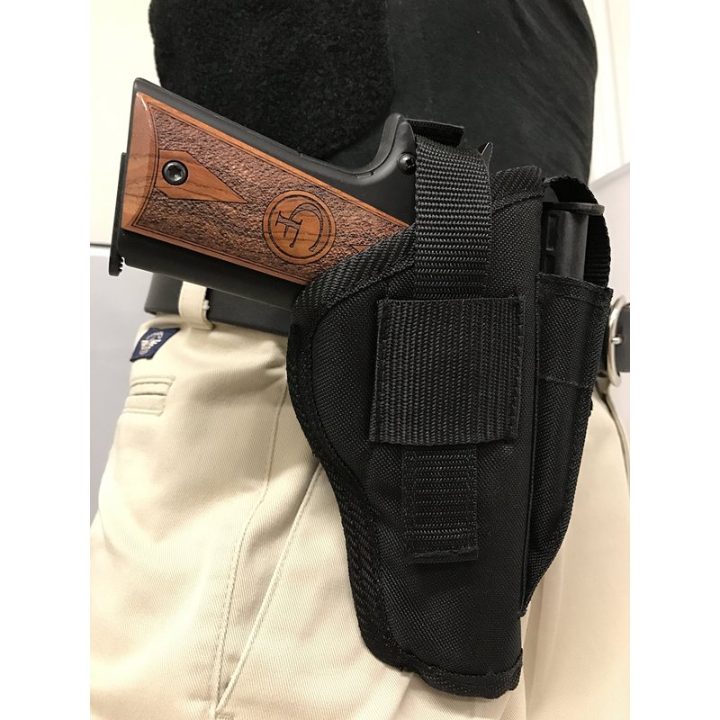 Gun Holster Offers: * Ambidextrous - Use Left or Right Handed - Switch Thumb Retention Strap and Clip From Side to Side * Metal Clip * Adjustable Thumb Retention Strap to Adjust to Your Gun * Gun Magazine Pouch Made on Front To Carry An Extra Clip. Versatile gun holster at an affordable price. We offer 30 day money back guarantee. Need more information, please contact us. We carry all sizes and we will try to help size up the holster for your needs if your holster is not listed.