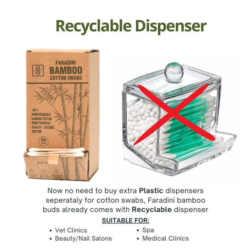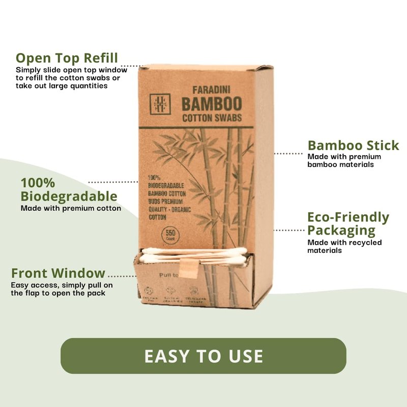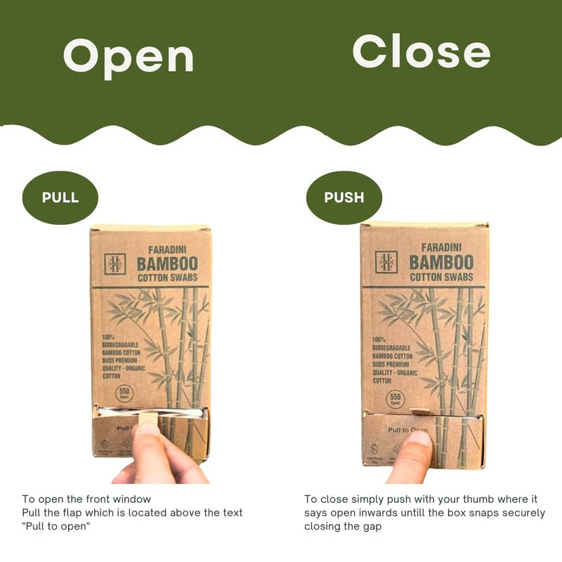 Crafted with care, our Bamboo Cotton Swabs are designed to match the quality and functionality of their plastic counterparts. Say goodbye to plastic waste and hello to a sustainable future! Our faradini bamboo Cotton swabs and its sustainable packaging will put you at ease for the purpose of conveniently taking a few pieces whenever you need them thanks to the window at the front of the box. With a totally recyclable box and dispenser you no longer need to get a plastic dispenser separately. If you need larger quantities you always have the option of opening from the top side by removing the tray inside the box. For more instructions please have a look at the pictures. Made from 100% bamboo, they are strong, durable, and completely biodegradable. Unlike paper alternatives that easily soak up water or bend, our bamboo sticks remain intact even during the most delicate tasks. Whether you're tidying up hard-to-reach spots or indulging in arts and crafts projects, our Bamboo Cotton Swabs will provide the perfect precision. By choosing our bamboo cotton swabs, you're not only making a positive impact on the planet but also reducing your plastic footprint significantly. Join the movement towards sustainability and take pride in knowing that every small action counts towards a greener future. Box dimension: LxWxH= 3.5 inch x 3.1 inch x 6.9 inch weight 0.425lbs Product length= 3 inch