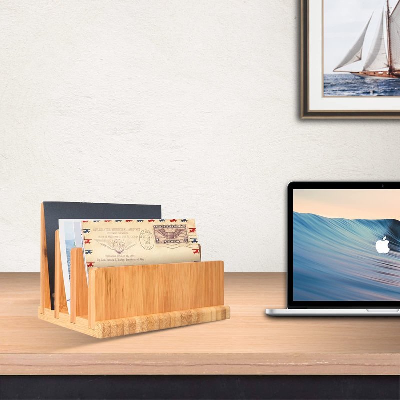 Bamboo Mail Organizer with Rubber Feets, wishacc Vertical Desk Letter/Envelope/File/Paper/Folder/Bill Holder for Office & Home, Small 3 Sections Desktop Office Supplies Incline Sorter Rack