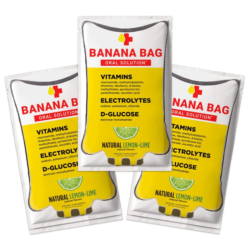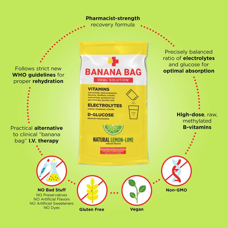 Banana Bag Oral Solution (BBOS) is a Powerful, Pharmacist-Developed Alternative to the Typical "Banana Bag" Therapy of Vitamins & Electrolytes Given Intravenously in Healthcare Settings. Now Available in a Convenient, Portable, Fast-Acting Powder to Dissolve in Water and Drink that Can Effectively Manage Dehydration, Exhaustion, and Immune Health on a Therapeutic Level at Home or Wherever you Need Clinical Relief... No Needles Necessary.