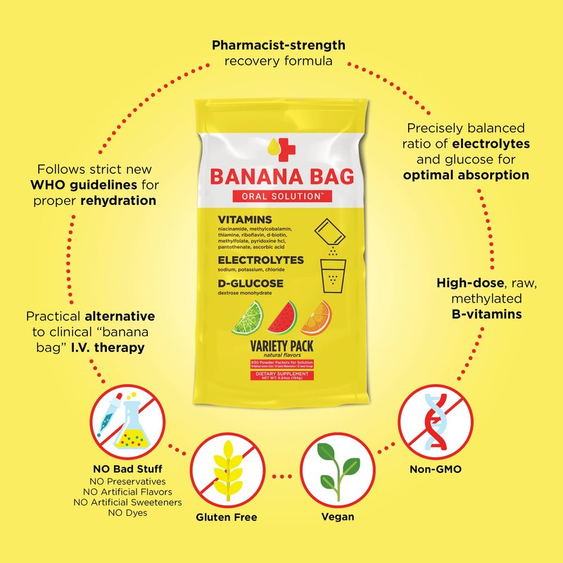 - WHAT IS IT? A formula of high-dose B-vitamins with electrolytes to be the practical oral alternative to traditional IV Banana Bag therapy.
