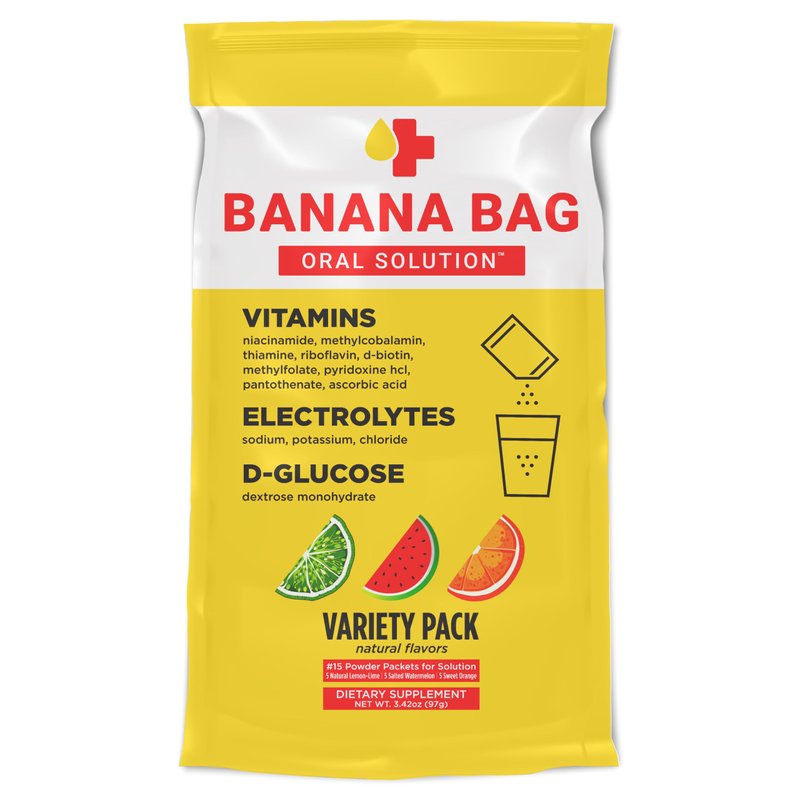 Banana Bag Oral Solution - Pharmacist Hydration Recovery Formula - Electrolyte & Vitamin Powder Packet Drink Mix - Variety Pack - Pack of 15