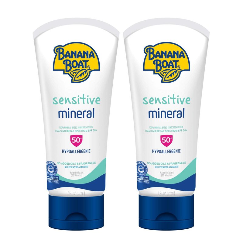 Banana Boat Sensitive 100% Mineral Sunscreen Lotion SPF 50 Twin Pack | Body Sunscreen, Sensitive Skin Sunblock, Oxybenzone Free Sunscreen, Banana Boat Mineral Sunscreen SPF 50, 6oz each