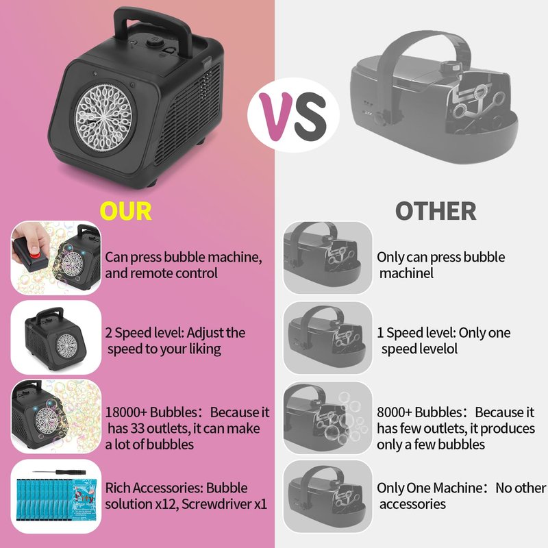 - Upgrade details-2: The new design of 33 bubbles exits makes it possible to produce up to 18,000 bubbles per minute, and a large number of bubbles can meet the needs of various scenes, such as birthdays, parties, weddings, outdoor activities and a series of activities.