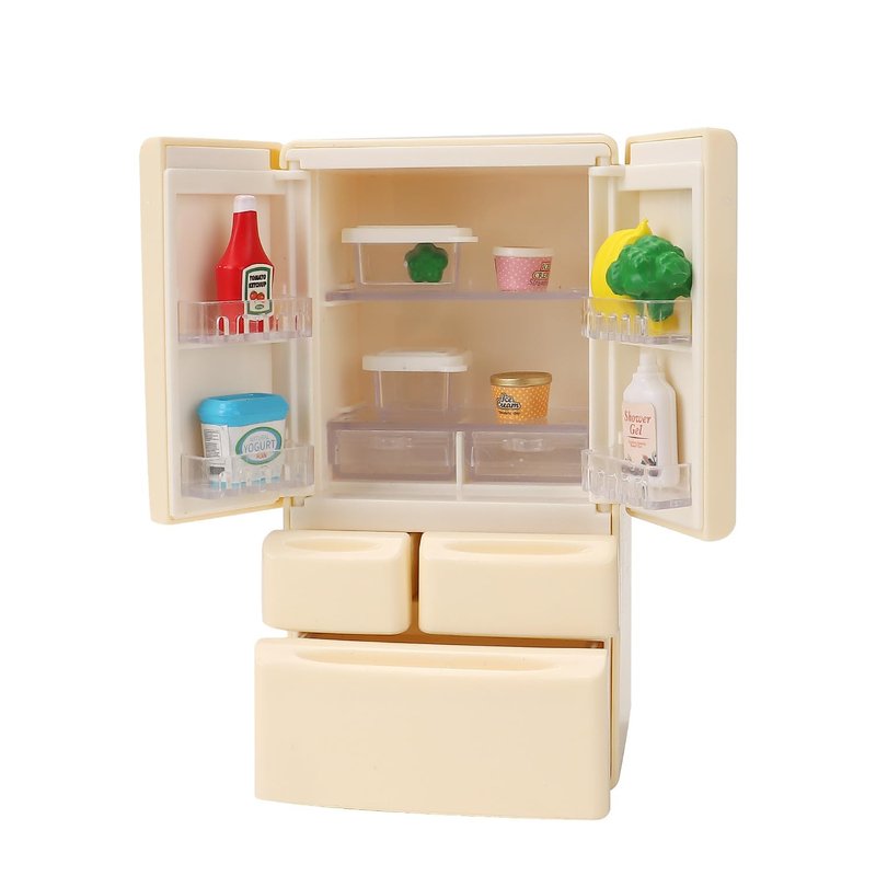- The refrigerator door and multiple drawers can be opened to store doll accessories.
