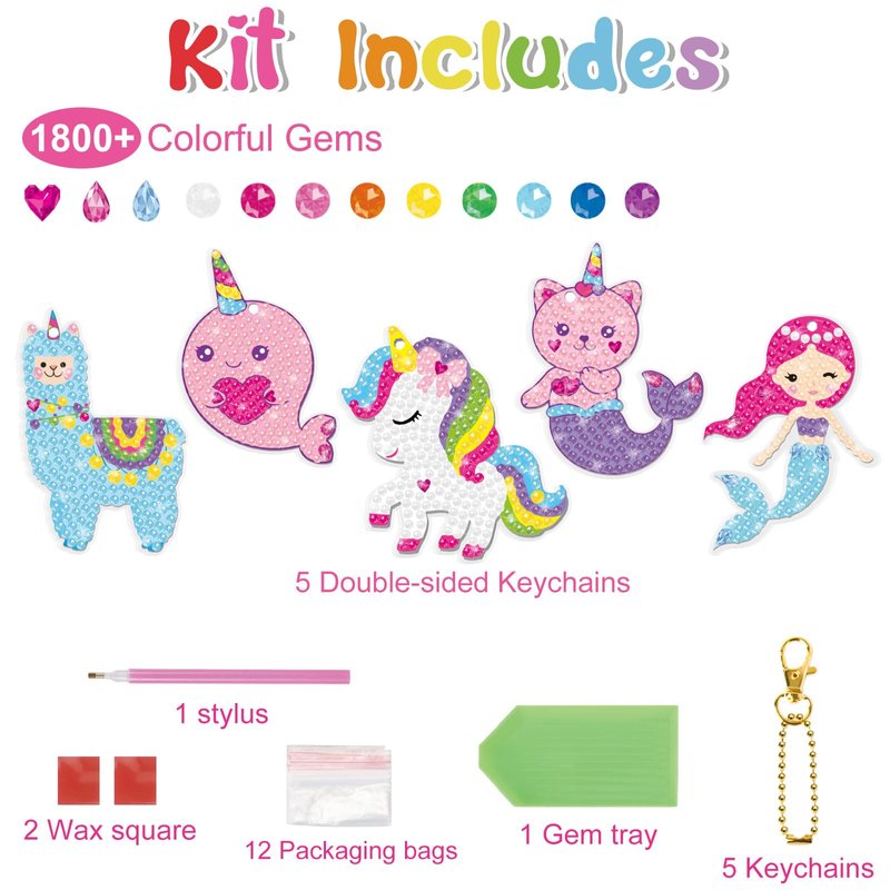 - Sparkly Diamond Art Keychains:This Gem art kit for kids features various magical creature patterns,cute and delightful. These double-sided diamond art keychains are the cutest accessories to hang on keys, backpacks, wallets
