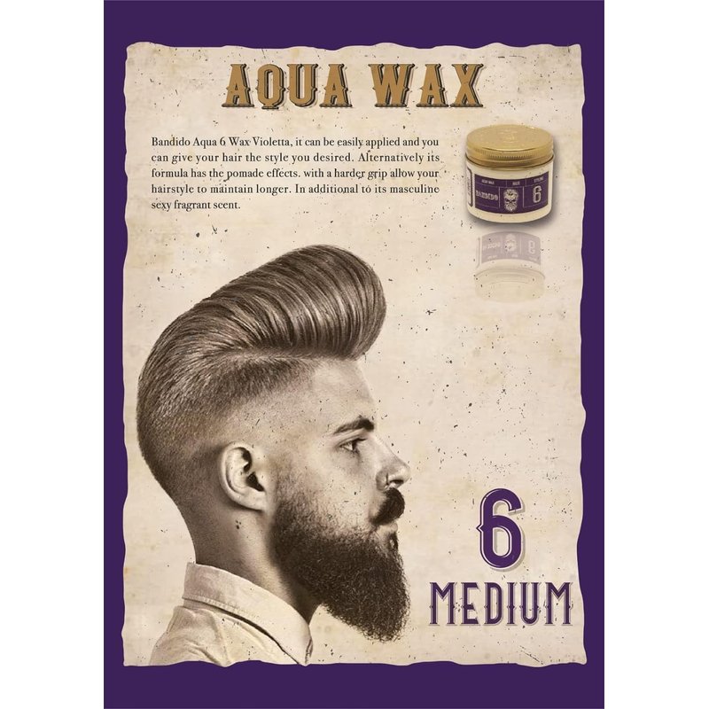 Bandido Aqua 6 Wax Purple is crafted with a medium hold to keep your hair manageable while providing solid hold. Its nourishing formula also provides shine, texture, and volume. Bandido Aqua Wax has a light and masculine sexy scent that everyone will love. Application is easy--just take the desired amount in your hand and spread equally into your hair. Need more hold? Check out Bandido Aqua Wax 7 or 8. Want something lighter? Bandido Aqua Wax 5 or 4 has you covered.