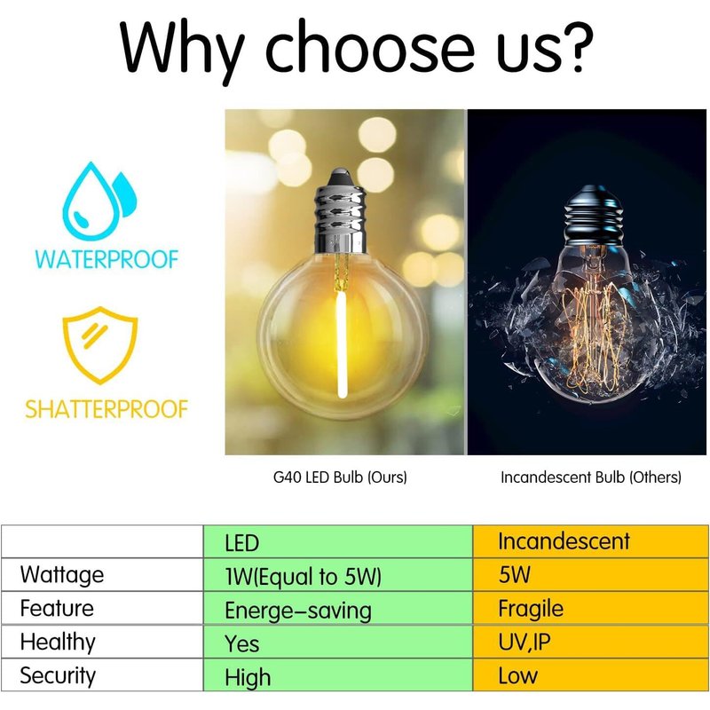 - Waterproof and Shatterproof: Fully sealed sockets and plastic bulbs protect from rain and wind