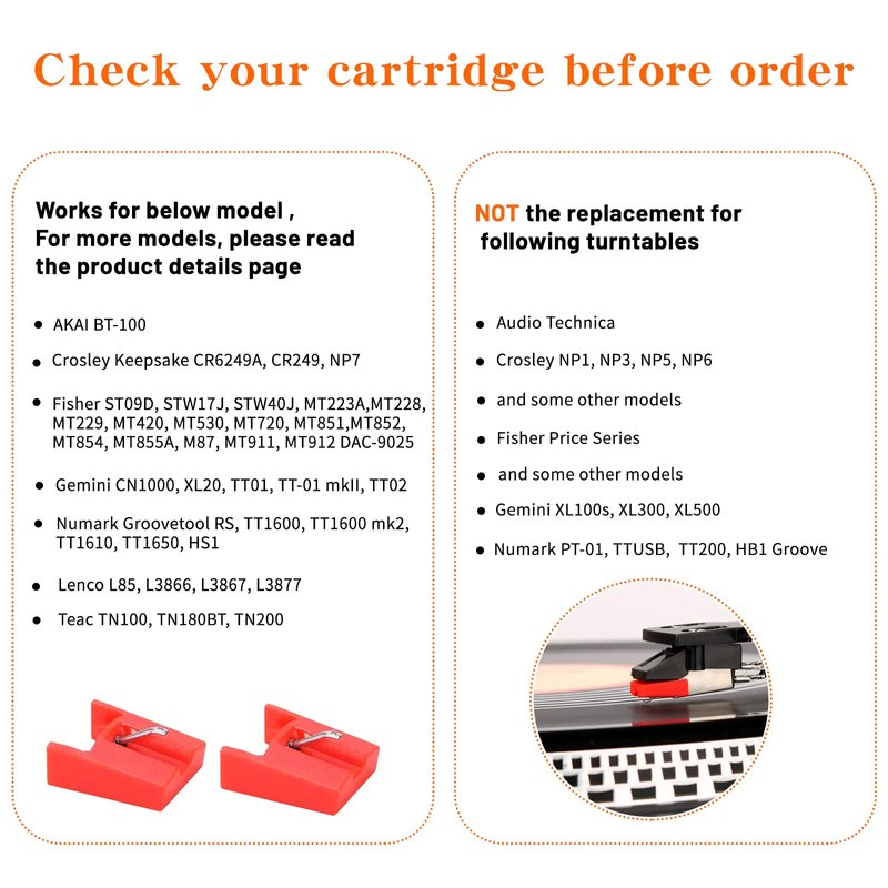 - Compatible with most of turntables like: Ariston, AKAI, Crosley, Fisher, Gemini, Ion, Kenwood, Lenco, Numark, Philips, Pyle, Sanyo, Sharp, Sony and Teac.