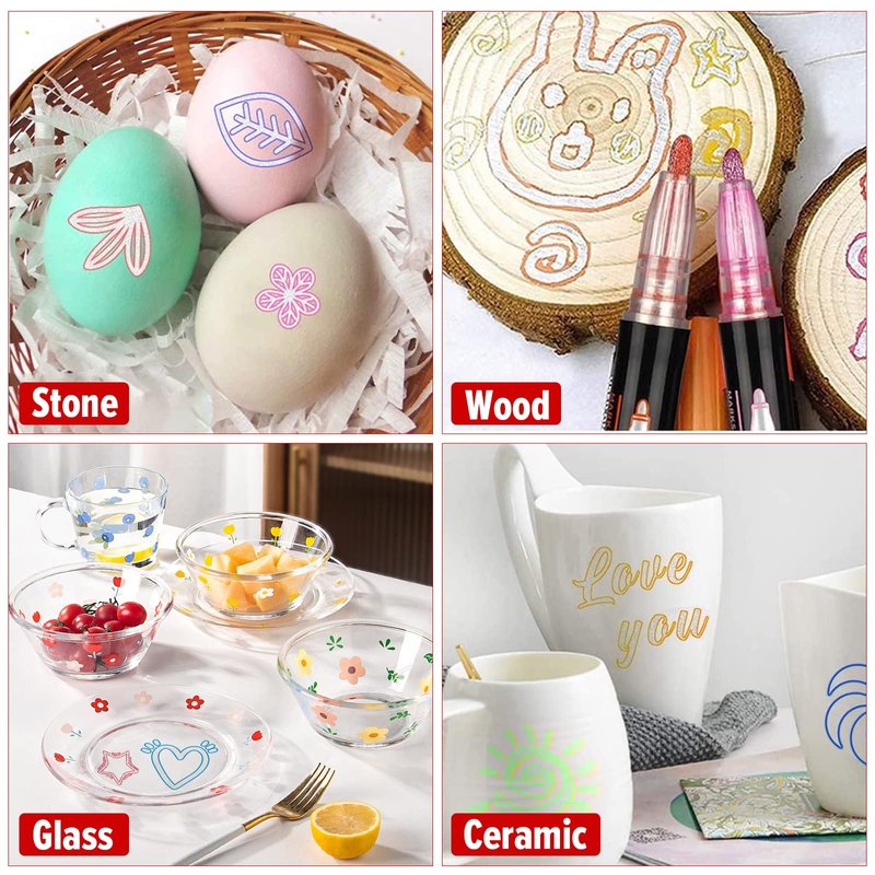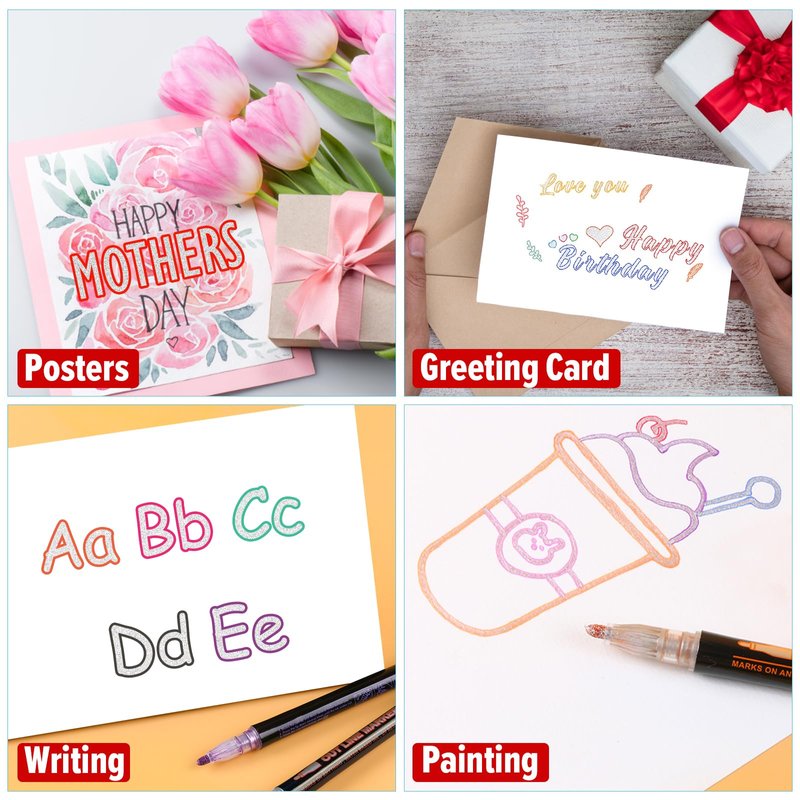 - 【Wide Application】Our Outline Markers Pens are perfect for Art, Drawing, Doodles, Posters, Painting, Rocks, Card Making, Eggs to Decorate. It's perfect for adults and kids for Christmas Card Writing, Birthday Greeting, DIY Art Crafts. It is suitable for most smooth surfaces like Wood, Canvas, Ceramics, Metal, Stone, and Glass. NOTE: Please use shimmer markers on cardstock, not regular coloring paper to avoid bleeding.