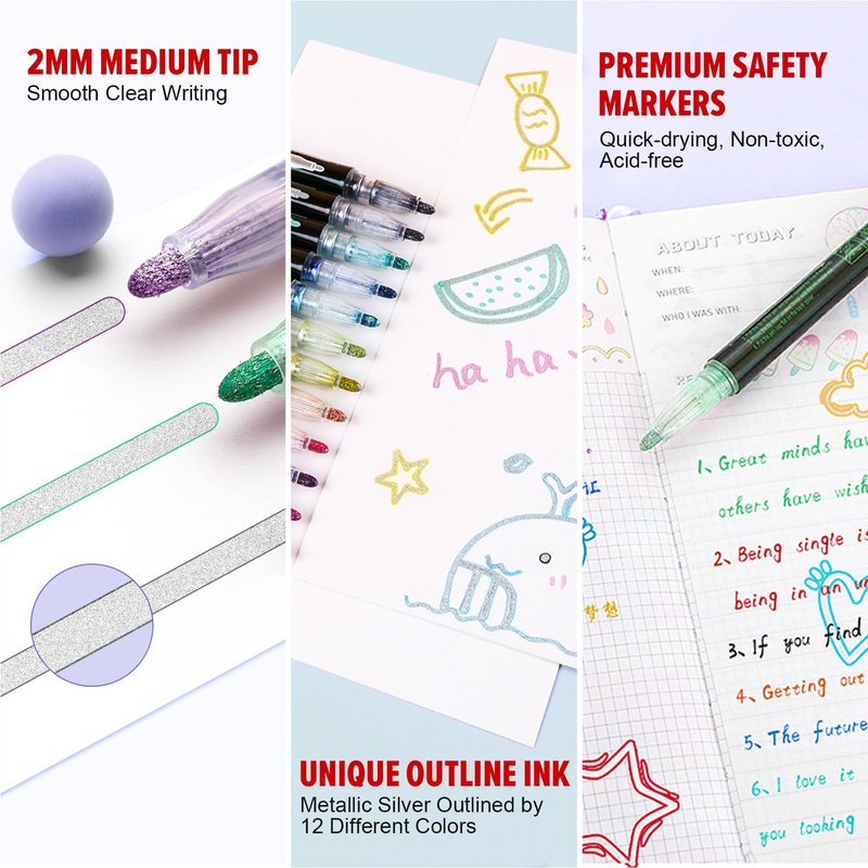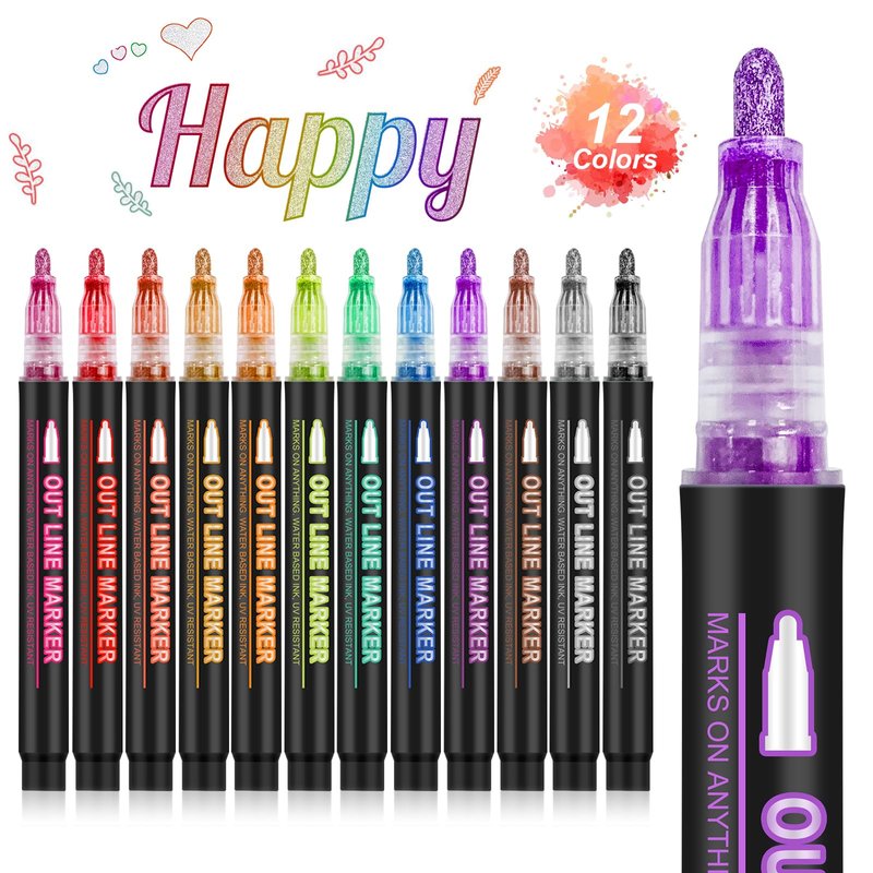 - 【12 Unique Colors Glitter Pen】Banral double line outline markers contain 12 bright and shimmer metallic colors. The self-outline markers with 2mm medium tip write in silver metal texture surrounded by a colored border. The ink has adhesion, bright and clear colors, beautiful lines, and easy to write. Smooth and shimmery! Adds sparkle embellishment to various craft work.