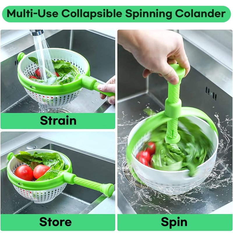 ✔A Colander with Twist: Use it to drain your Pasta and wash your Veggies, Fruit or twist it into a spinner! The pump-action handle rotates the spinning colander, drying your produce in a matter of seconds.