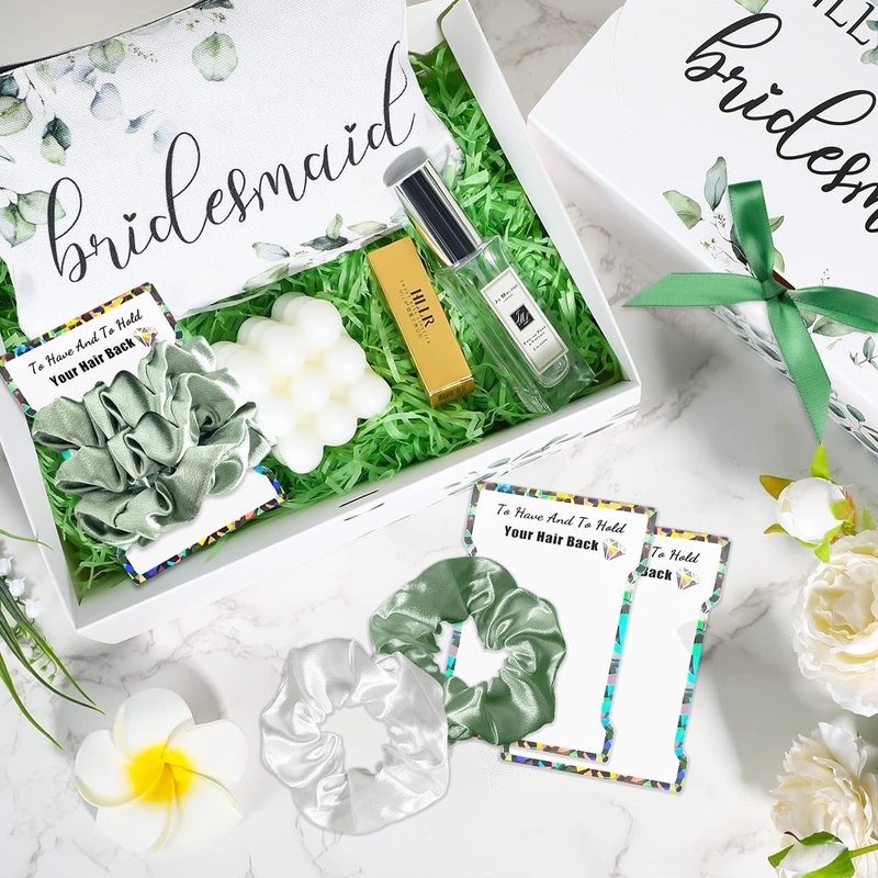 - đ°ăPerfect Bridesmaid Proposal Box StuffersăThere are 24 scrunchies in total (Set of 8). Each set comes in a laser card that says 'To have and to hold your hair back', making it easy to present the scrunchies as bridesmaid proposal gifts or bachelorette party favors. It's a thoughtful and elegant way to show your appreciation