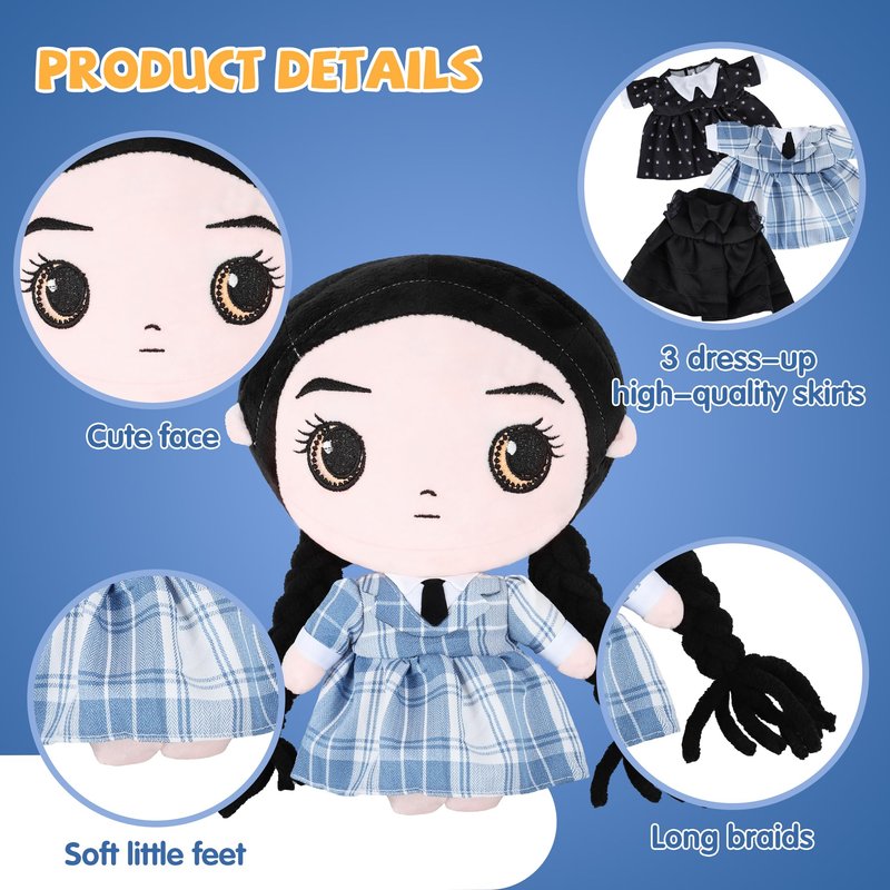 - Versatile Dress-Up Toy : The Plush toy set sparks young girls' imagination and creativity, providing a fun DIY playtime experience. Transform plush toy with three unique outfits: an everyday black floral dress, a classic prom cake dress, and a charming uniform dress. Each outfit features exquisite handmade details and easy-to-use invisible Velcro closures.