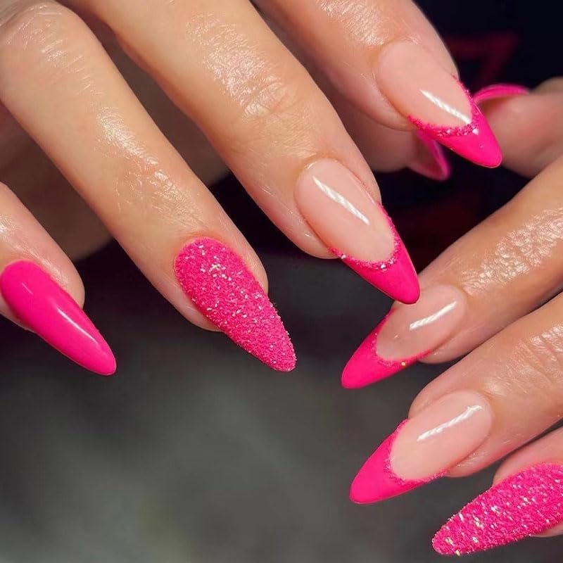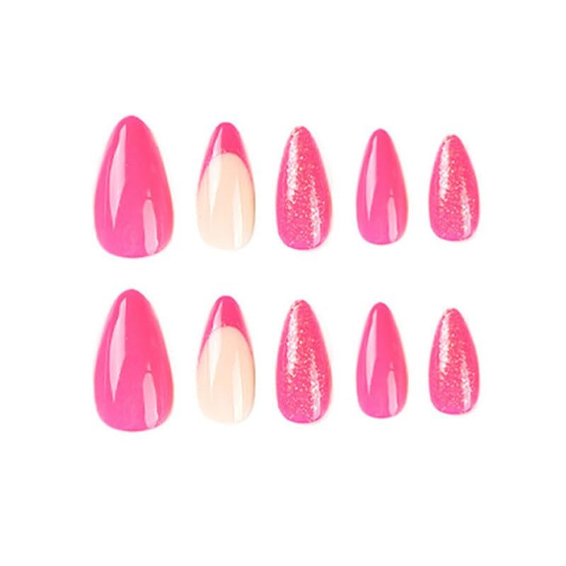 BAOYAALIN Hot Pink Press on Nails Medium Almond Shaped Fake Nails with Glitter Design Full Cover False Acrylic Glue Stick on Nail for Women Girls 24Pcs