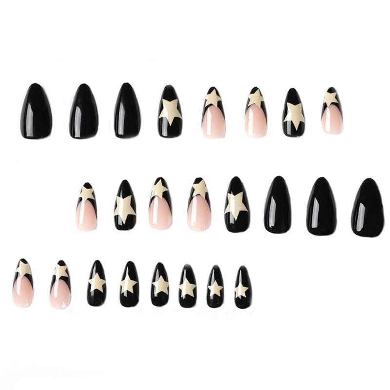 BAOYAALIN Medium Press on Nails Almond Shaped French Tips Black Fake Nails with Star Design Full Cover False Acrylic Glue Stick on Nail for Women Girls 24Pcs