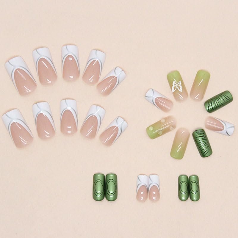 - Package Included - 24PCS BAOYAALIN full cover french white press on nails medium square with 3d alloy butterfly design contains 24 pieces full cover reusable artificial acrylic fake nails, 24 pieces adhesive nail jelly stickers, 1*mini nail file, and 1*wooden stick