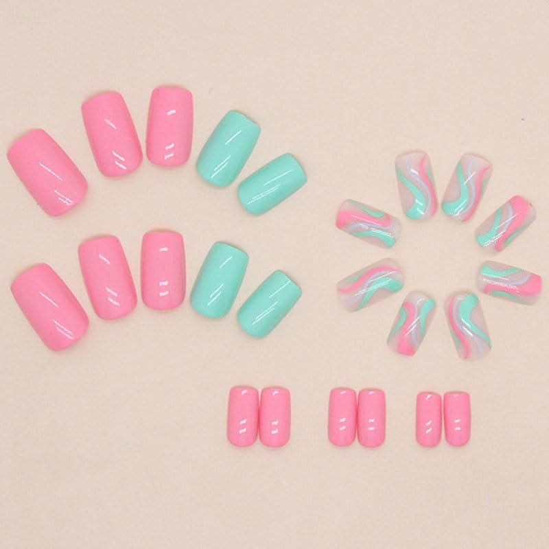 - Package Included - 24PCS BAOYAALIN full cover pink fashion press on nails medium square with simple waves design contains 24 pieces full cover reusable artificial acrylic fake nails, 24 pieces adhesive nail jelly stickers, 1*mini nail file, and 1*wooden stick