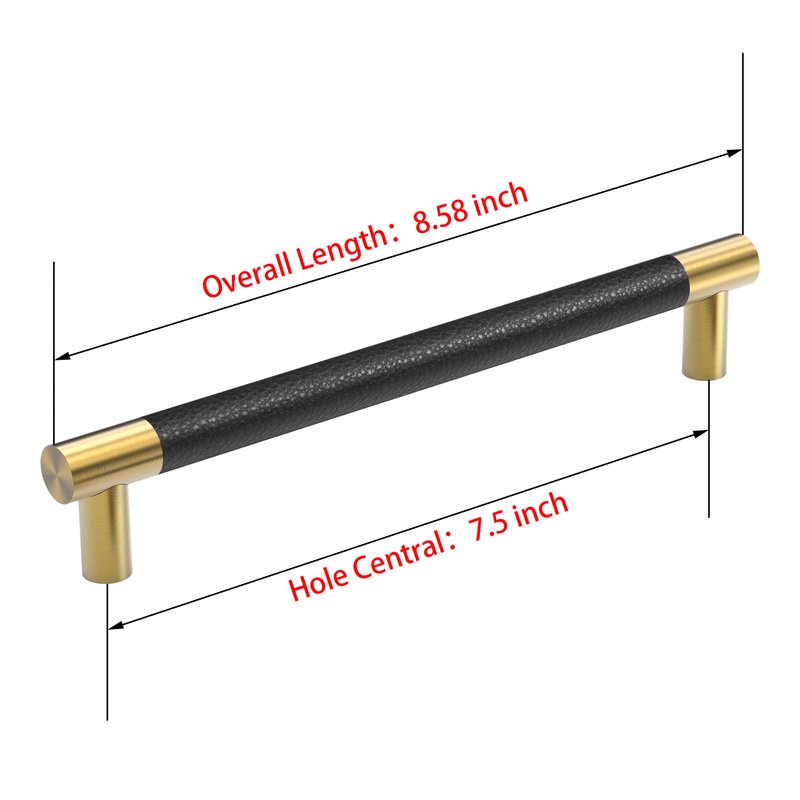 Bar Cabinet Handle Knob Pull Brushed Satin Gold/Brass Finish with Upholstered Black Leather 8.5" (7.5" Hole Center) for Kitchen Cabinet Hardware/Dresser Drawer Handles, 5 Pack