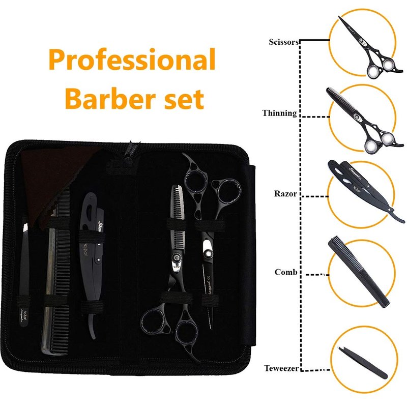 - Package Included: 1 x Regular hair scissors; 1 x thinning scissor; 1x Barber Razor; 1 x grooming comb; 1 x free case; 1 x Tweezers; 1 x Pack Blades.
