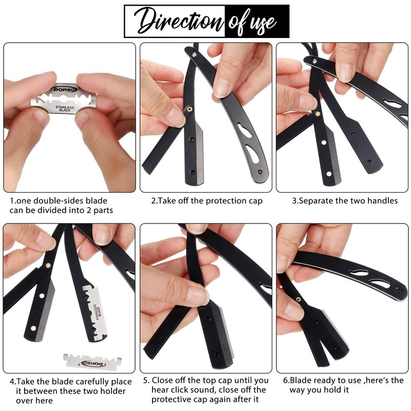 - Durable to use: our barber straight razors are made of quality stainless steel, which is sturdy and not easy to get rusty or scratched with use, built with a blade guard which is easy to open, safe for you to change or replace each blade effortlessly; This neck duster brush is adopted with fine high-density nylon fiber bristles, comfortable and soft, that are gentle on skin and work well for brushing off hair around the neckline and ears after a haircut