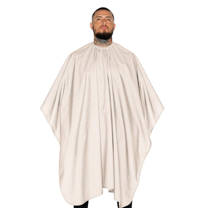 The Barber Cape. A timeless classic re-engineered with water resistant, static-reducing carbon fiber material to help repel hair. Features extra length in the back which drapes down that cover the chair to keep clients clean during their service. An ultra-flex elastic neckband accommodates a wide range of clients and provides comfort.
