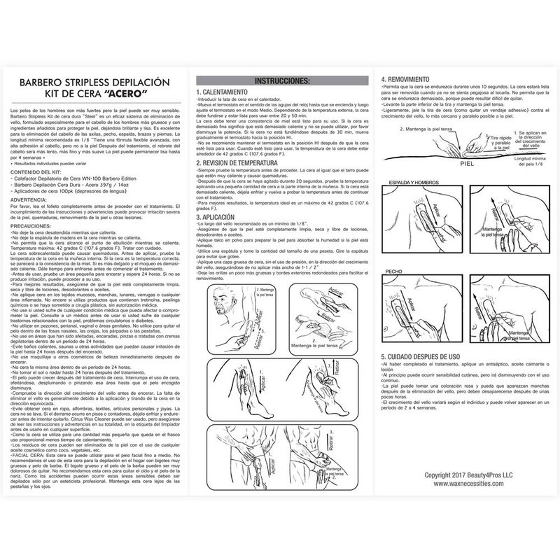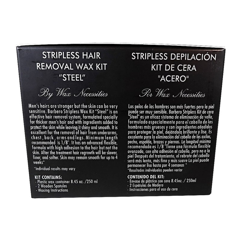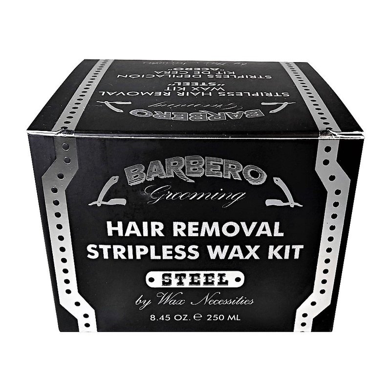 Men's hair is stronger but the skin can be very sensitive. Barbero Stripless Wax Kit "Steel" is an effective hair removal system, formulated especially for thicker men's hair and with ingredients added to protect the skin while leaving it shiny and smooth. IMPORTANT NOTE: Please read the booklet in full before proceeding with treatment. Failure to follow instructions cautions, and warnings may result in severe skin irritation.