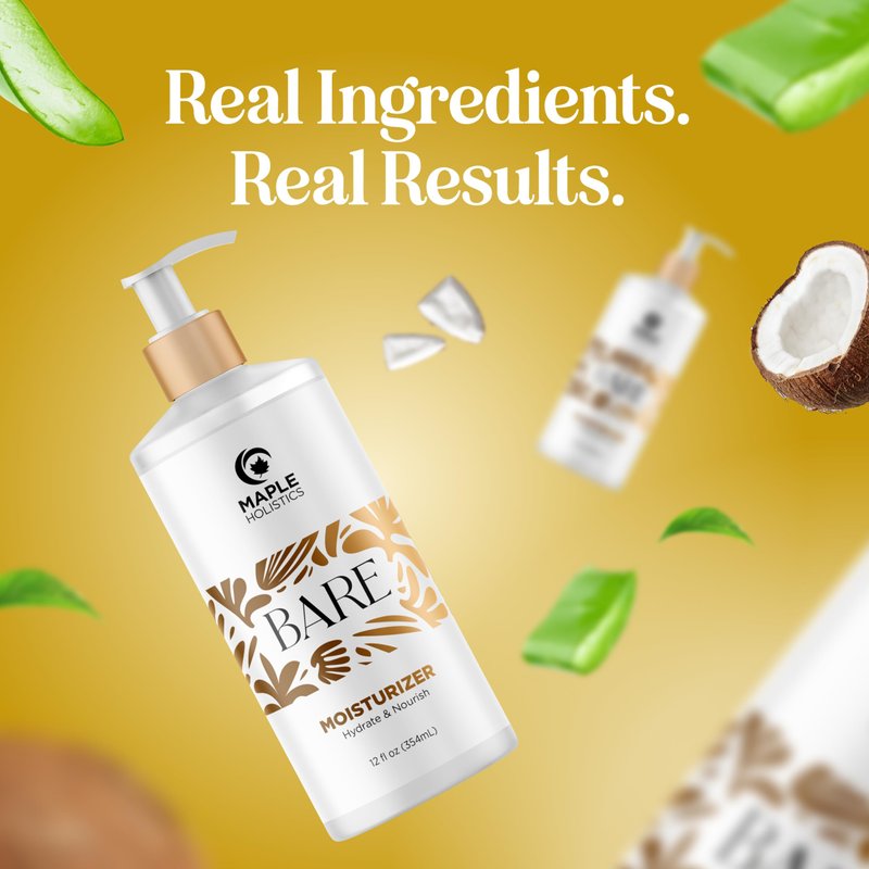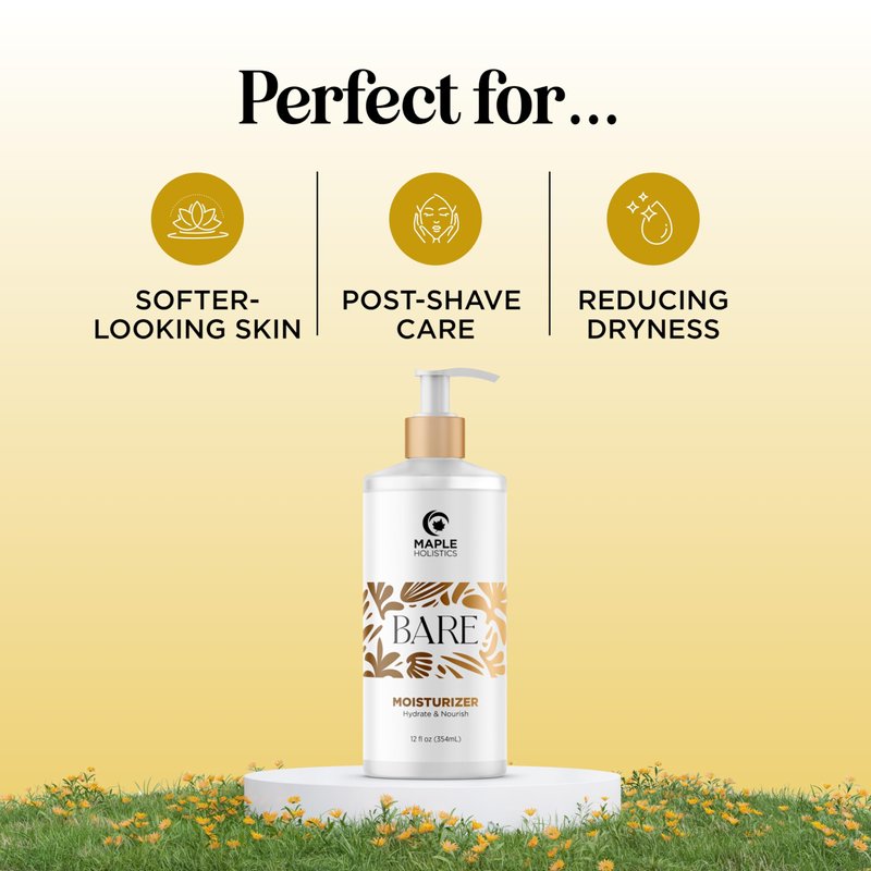 Introducing Bare, the ultimate women's shaving kit by Maple Holistics, designed for a flawlessly smooth shave every time. Say goodbye to irritation and hello to silky-smooth skin with our meticulously crafted 4-step ritual. Each step is carefully formulated to provide maximum comfort and effectiveness, ensuring a luxurious shaving experience like no other. Whether you're grooming your legs, underarms, or delicate intimate areas, Bare is gentle yet powerful, giving you the confidence to bare it all. Begin with our soothing ingrown hair scrub, meticulously formulated to cleanse and prep your skin for a flawless shave, leaving it smooth, soft, and glowing. Next, indulge in our premium shaving oil for women, replacing traditional creams with unparalleled lubrication for a friction-free shave. Enriched with hydrating avocado and jojoba oils, it ensures a close, comfortable shave every time. Follow up with our soothing ingrown hair serum, starring witch hazel to cleanse and clear pores, preventing redness, bumps, and ingrown hairs, leaving your skin calm and refreshed. Complete your ritual with our indulgent in-shower body lotion, formulated with nourishing botanical oils to lock in moisture, leaving your skin flawlessly smooth and hydrated. With Bare, shaving becomes more than just a routine – it's a luxurious self-care experience that leaves you feeling confident and radiant. Elevate your grooming routine with Bare, the ultimate women's shaving kit by Maple Holistics.