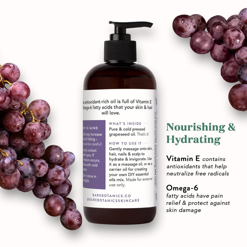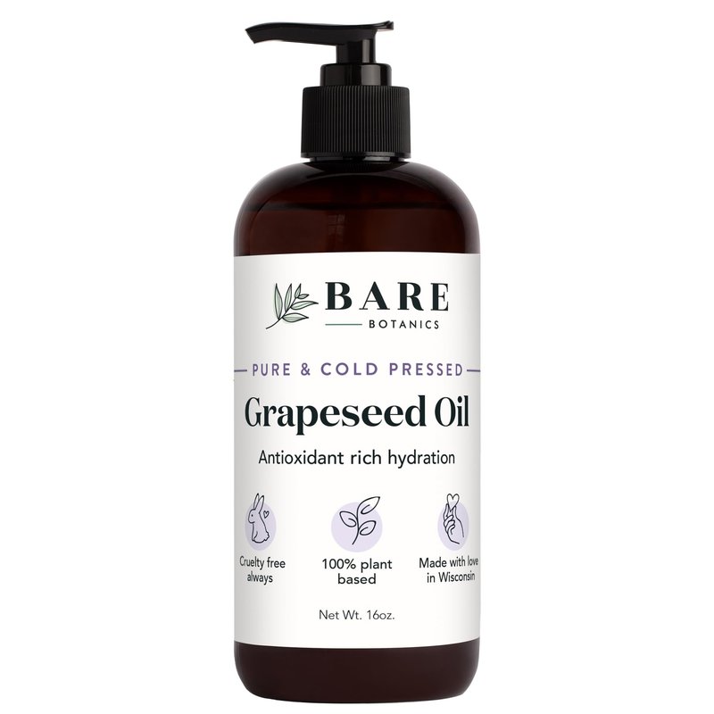 Bare Botanics Pure Grapeseed Oil 16oz | 100% Pure & Cold Pressed Grape Seed Oil for Hair & Dry Skin | Grapeseed Body Oil for Massage | Vegan Cruelty-Free and GMO-Free