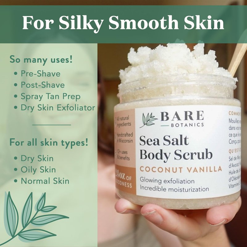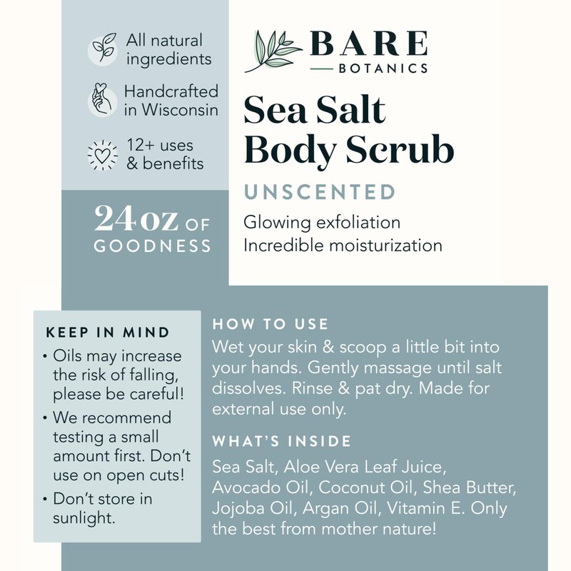 Bare Botanics Unscented Body Scrub 24oz | Made in Madison, WI | All Natural Body Scrub w/Skin Loving Moisturizers | Vegan & Cruelty Free Sea Salt Exfoliator w/a Cute Wooden Spoon