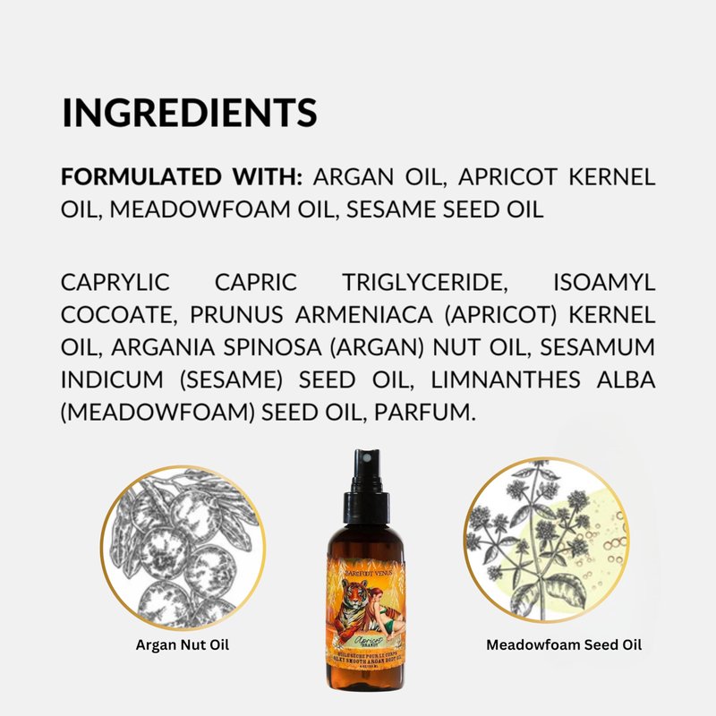 Description: Spray on instant moisture and bid dry, water-starved skin a fond farewell. Super-hydrating Argan oil, Apricot kernel oil and moisture giving Meadowfoam oil cloak skin in silky-smoothness. Created with: Argan Oil Apricot Kernel Oil Meadowfoam Oil Sesame Seed Oil Created without: Mineral Oil Parabens Propylene Glyco Synthetic Colour Package includes: 1 of Apricot Brandy Argan body oil (120ml)