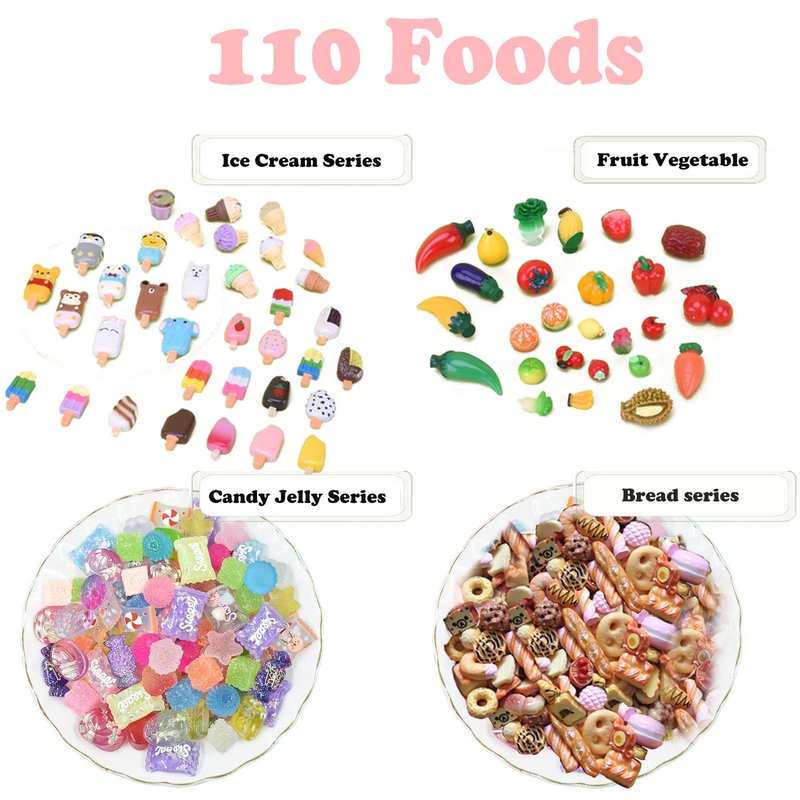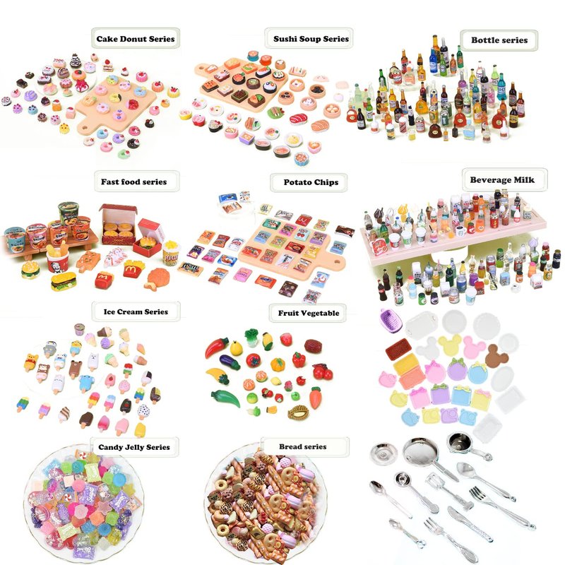 - 🍬🍭🍦🍧🍰🍕🍔🍟【Value cute miniature accessories set】150 Value Packs that contain -- 110 Foods + 20 Drinks + 10 Plates + 10 Forks. Mixing colors and shapes randomly, enough quantity and styles, can help relieve stress, develop creativity and imagination, and bring you a lot of fun.