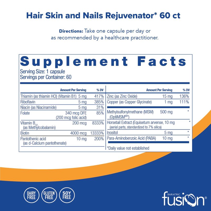 Bariatric Fusion Hair, Skin and Nails Vitamins REJUVENATOR is essential in preventing or minimizing hair loss after weight loss surgery. We know the struggle that patients have to maintain healthy Hair, Skin & Nails for women after undergoing Bariatric Surgery. Give your hair growth a captivating sheen, strengthen your nails and make your skin shine!* Just one easy to swallow capsule per day will support the body's natural rejuvenation of your Hair, Skin & Nails and you will feel great about it. Our easy to swallow One Per Day Capsule Bariatric Vitamins contains Biotin, Zinc, Thiamin, Folic Acid, Riboflavin, Copper, and much more to help with hair growth.* Ideal Bariatric vitamins for Gastric Sleeve.