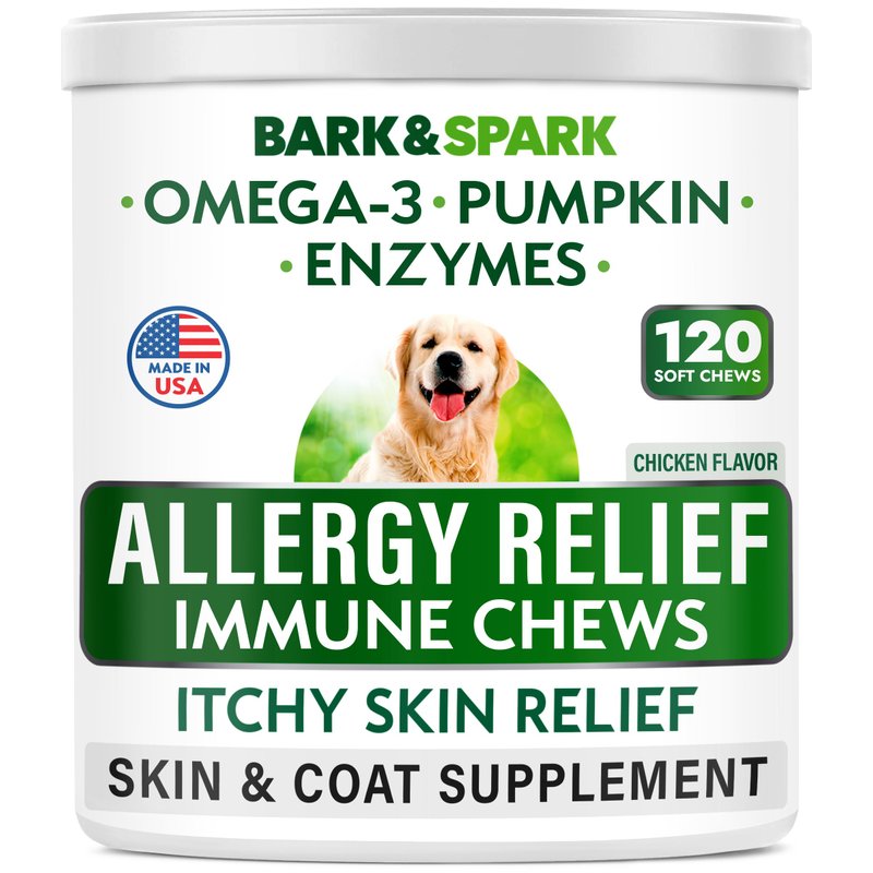 BARK&SPARK Dog Allergy Relief Chews - Anti-Itch Skin & Coat Supplement - Omega 3 Fish Oil - Itchy Skin Relief Treatment Pills - Itching&Paw Licking - Dry Skin&Hot Spots - (120 Immune Treats - Chicken)