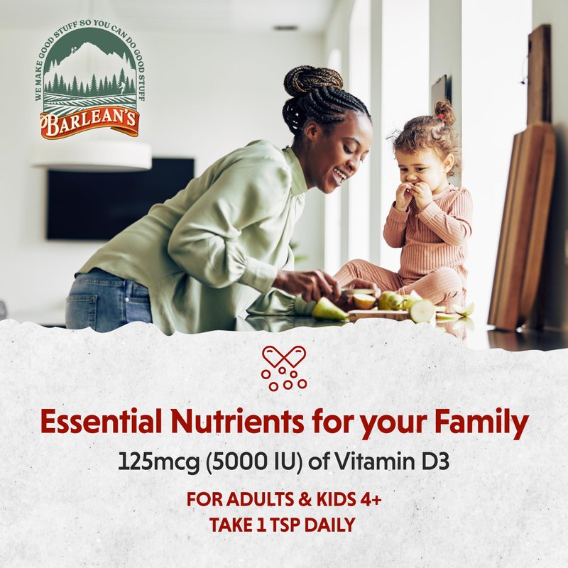- IMMUNE HEALTH: Help support immunity, healthy energy levels and bone strength with Vitamin D supplements. Barlean's Seriously Delicious Vitamin D3 has 125 mcg D3 per teaspoon serving for cognitive health, focus, and balanced mood. 30 servings of 5000 UI per container, sugar-free, dairy-free, non-GMO and gluten-free