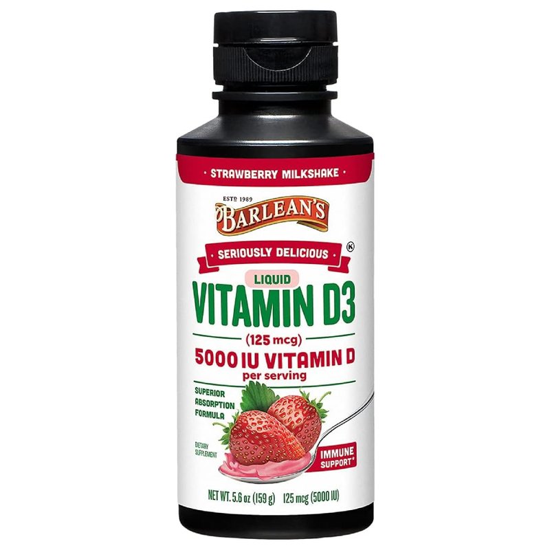 Barlean's Liquid Vitamin D, 5000 IU D3, Strawberry Milkshake Flavored for Kids and Adults, Maximum Absorption, Non-GMO, Gluten-Free - 5.6 oz