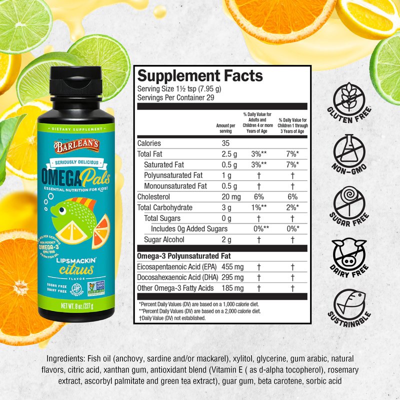 Barlean's Omega Pals Lipsmackin' Citrus Flavored Omega-3 for Kids, Yummy Children's Liquid Fish Oil Supplement with 750 mg of EPA & DHA for Brain & Eye Health, 8 oz