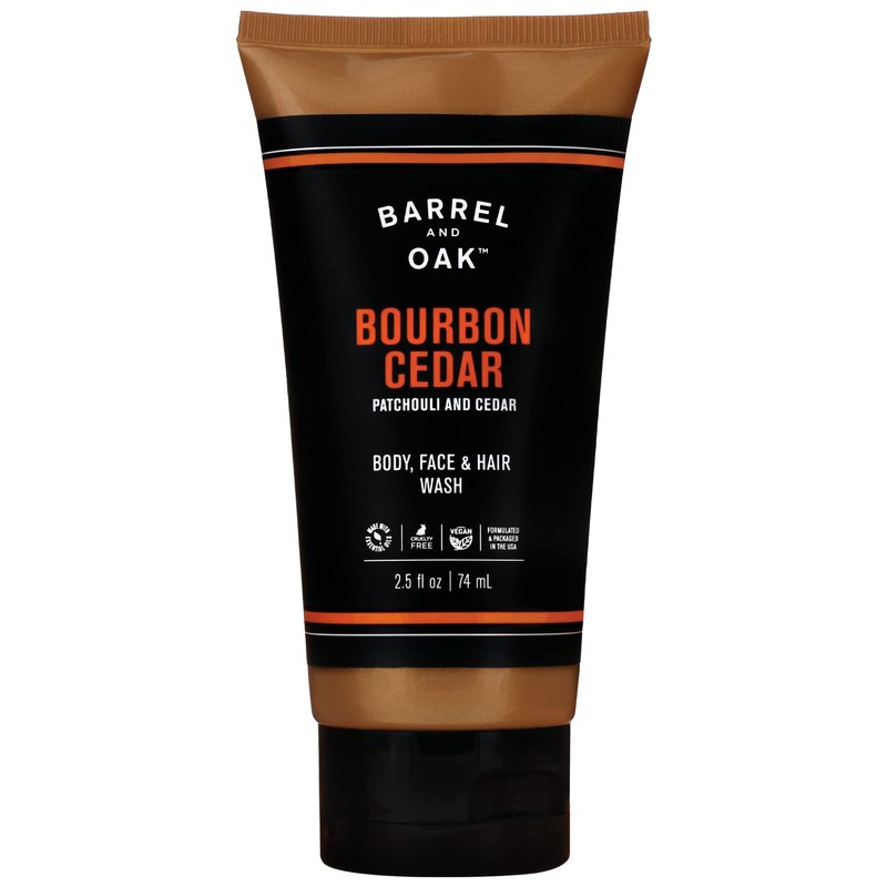 Barrel and Oak - All-In-One Body Wash, Men's Body Wash, Men's Soap for Hair, Face, & Body, Essential Oil-Based Scent, Cedarwood & Bourbon Aroma, Travel Size Body Wash, Vegan (Bourbon Cedar, 2.5 oz)