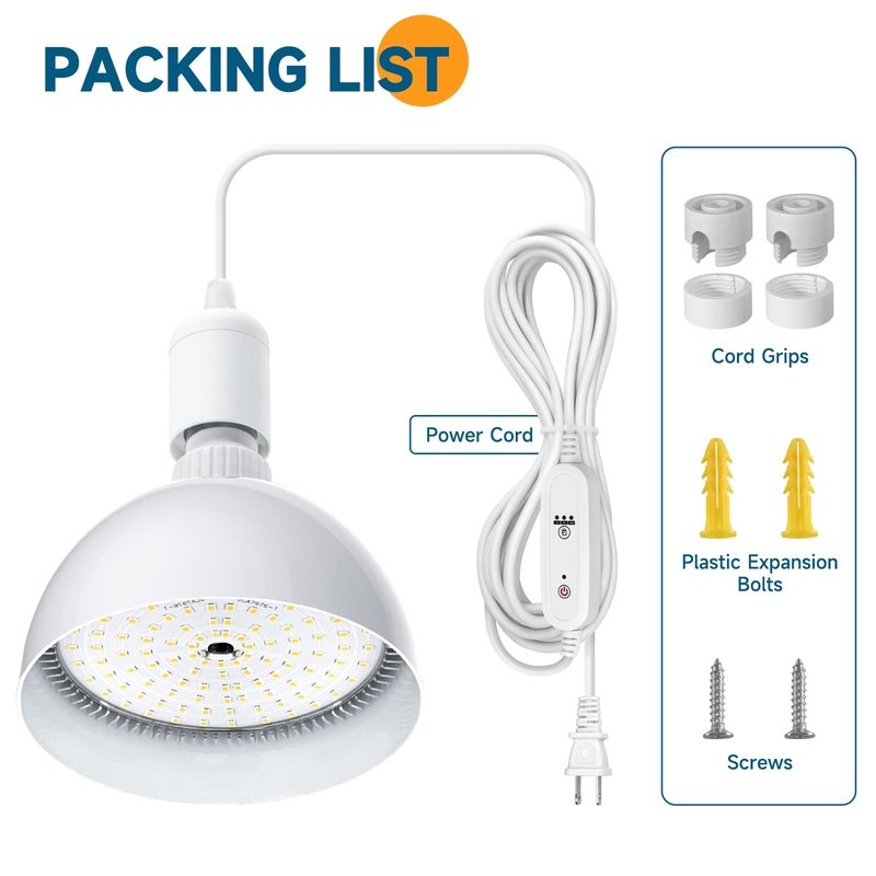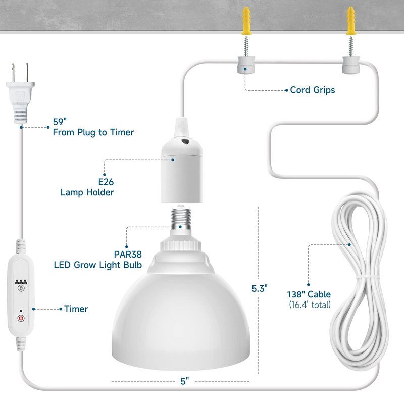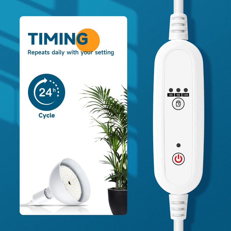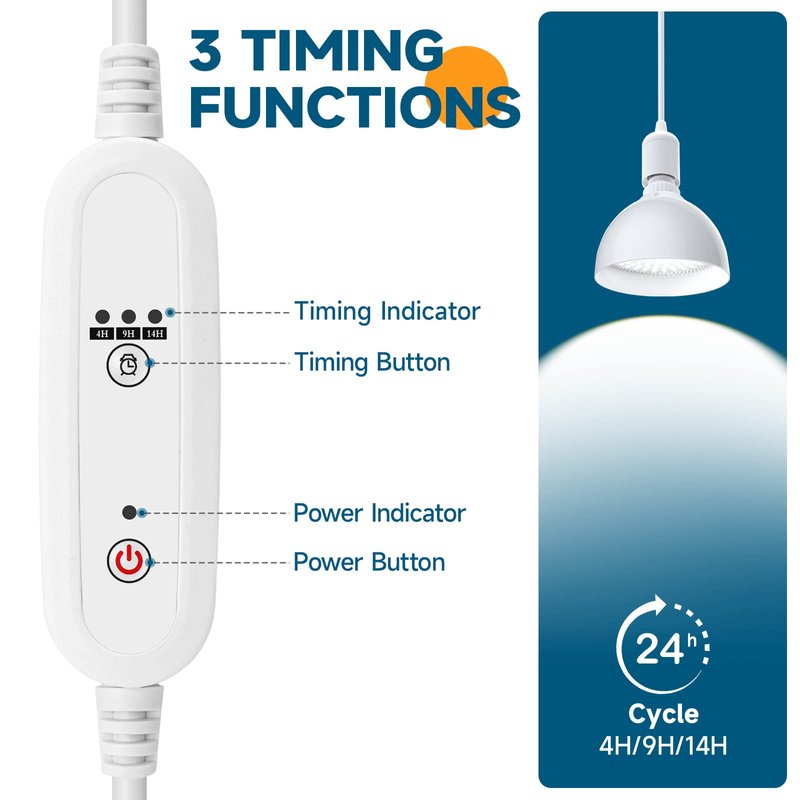 - Timer & Pendant: These indoor plant lights are easy to install and operate. Simply use cord grips to secure the 16.4ft power cable, plug it in, and set the timer. The timer offers three functions, 4H/9H/14H, and can be set to repeat daily