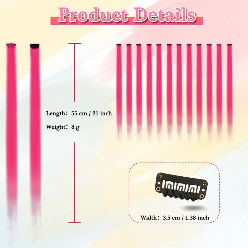 - 【Colored Hair Extensions】12 PCs set hot pink colored clip-in straight hair extensions, each single piece has a small clip on the end that make the wearing sooo Easy & Sturdy. Comes with a pack of small colorful leather bands to create more fun hairstyles!