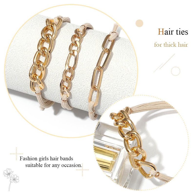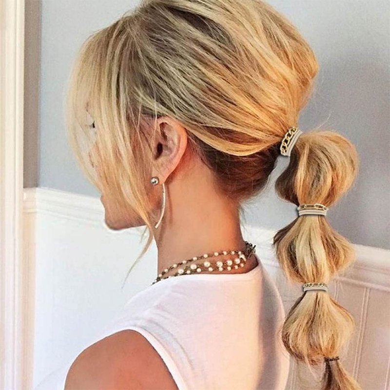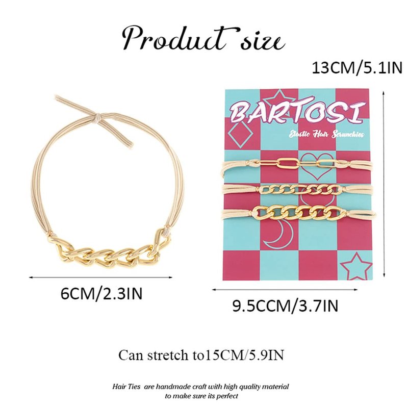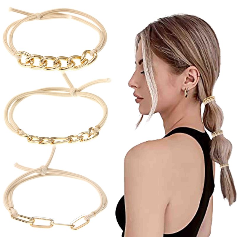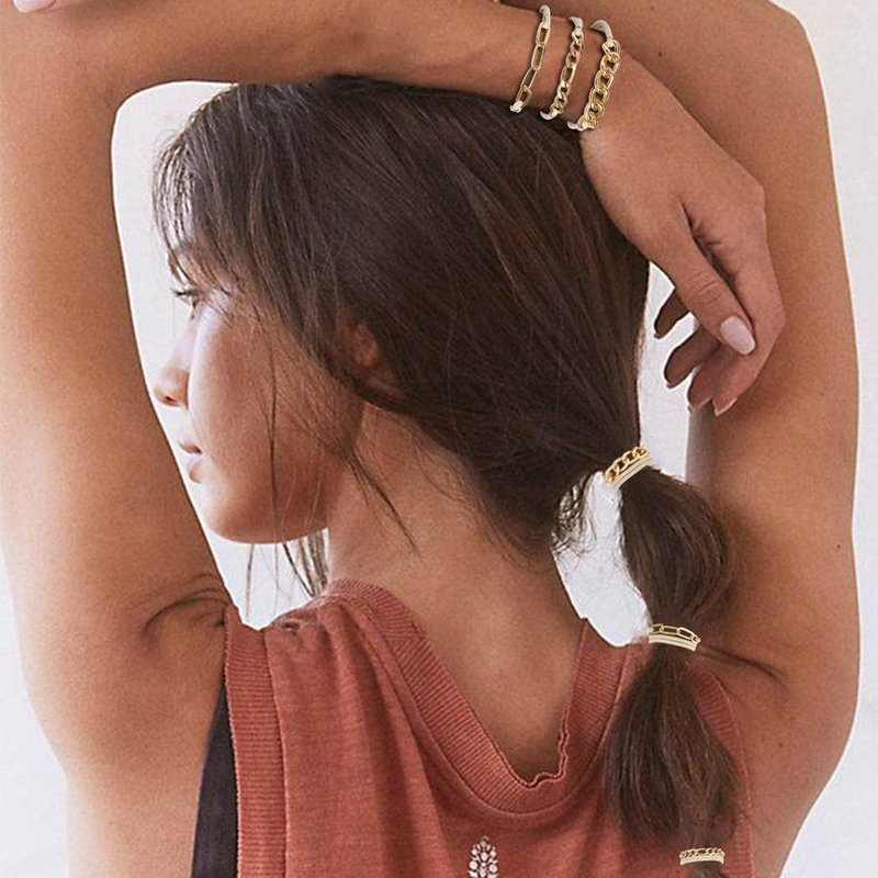- Hair ties for women made of high quality metal chain and elastic, quality highly elastic hair ties made with durability and fun-loving,which help to fix your hair for a long time without removing no matter what you are doing, what's more, it's not easy to break and deformation. And they looks awesome on your wrist and hair.