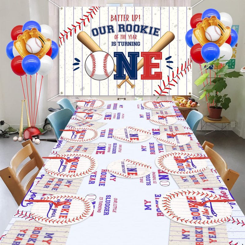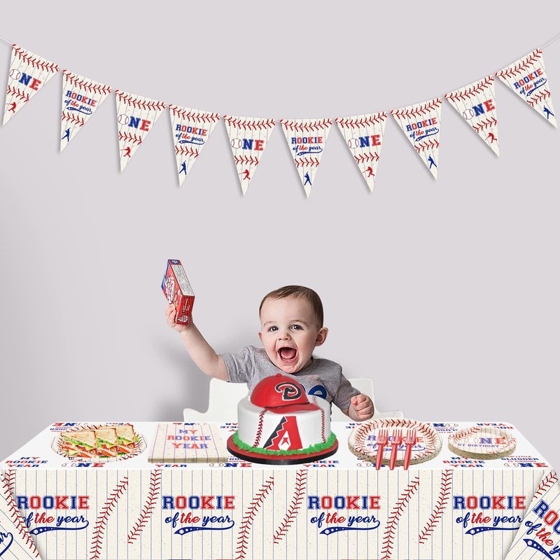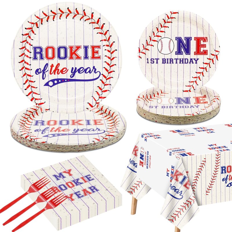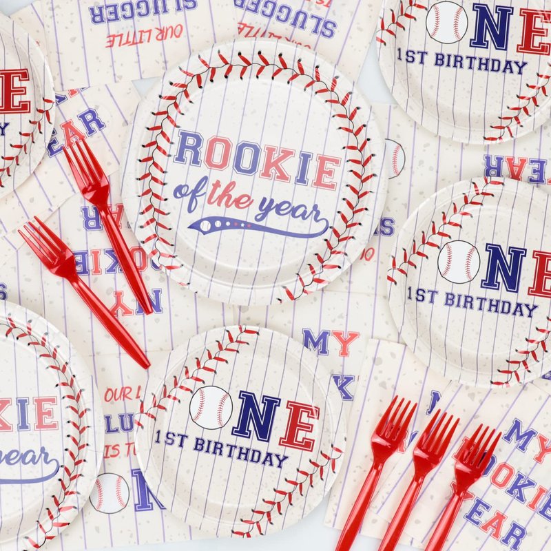 - 【Perfect Baseball Themed 1st Birthday Party Decorations】On the base of baseball, we chose the classical baseball-themed colors(red, blue, white) to design “MY ROOKIE YEAR” tableware. These exciting baseball decorations are sure to be a hit will all your guests, kids who are interested in sports themes.