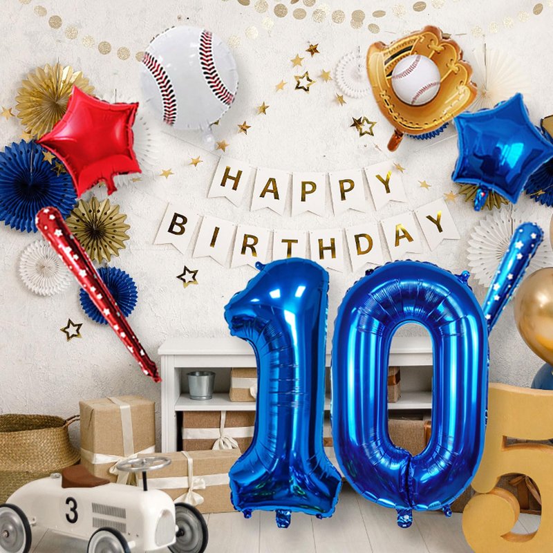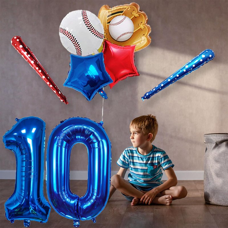 - 【Baseball party balloons】Baseball balloon number ballons set has 40 inch navy blue number 10 balloon x 1, 18inch foil baseball balloons x1,18inch baseball glove balloons x 1, 18inch star balloons (1 dark blue, 1 red),29.5inch baseball bat balloon(1 dark blue, 1 red),straw x 1, ribbon x 1.Tips: Balloon sizes are the size before inflation. The size after inflation will be slightly smaller than the size before inflation.