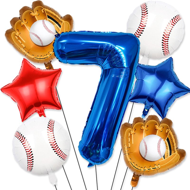 - 【Baseball party balloons】Baseball balloon number ballons set has 40 inch navy blue number 7 balloon x 1, 18inch foil baseball balloons x2,19.6*18.3inch baseball glove balloons x 2, 18inch star balloons (1 dark blue, 1 red),straw x 1, ribbon x 1.