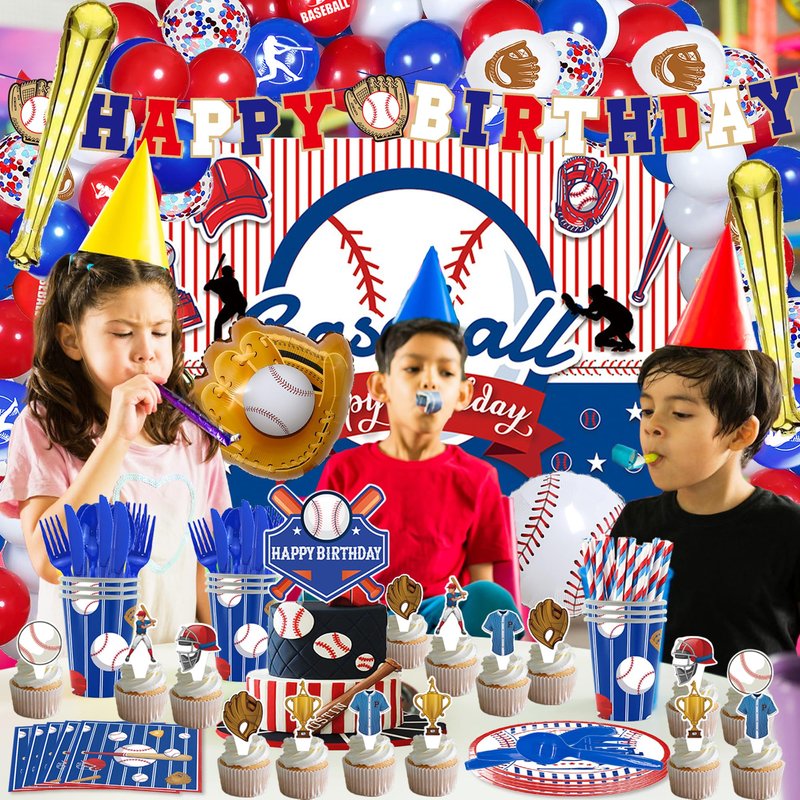 - Baseball Themed Designs: Baseball themed party decorations Featuring classic baseball colors - blue, red and white, and stylish baseball pattern designs, just this baseball birthday set makes your party fun and saves you from unnecessary hassles.